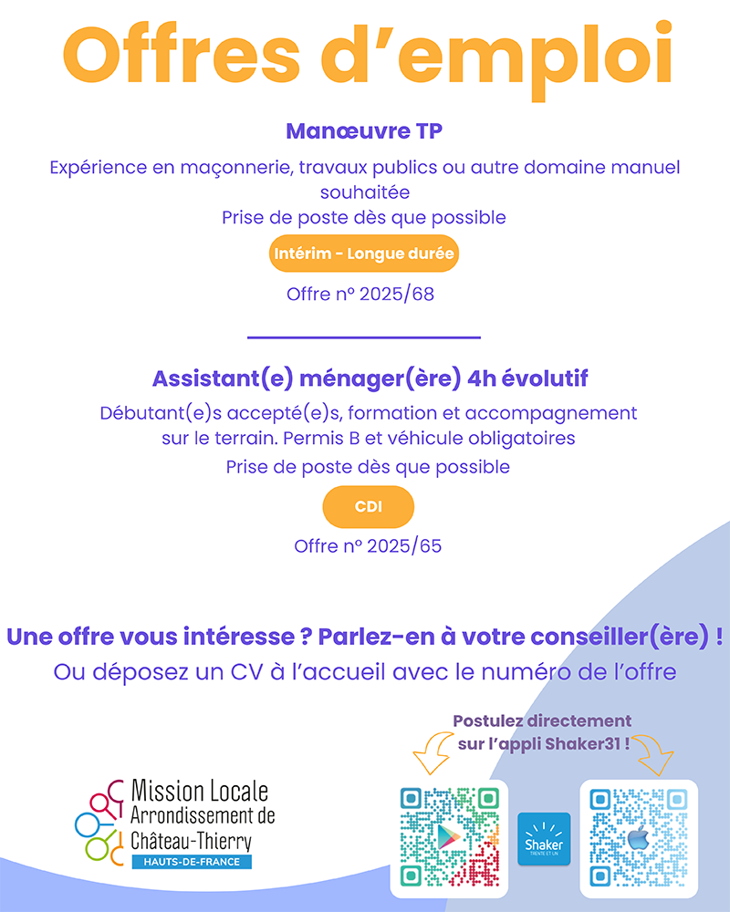 Elle permet de consulter et postuler facilement à des offres en contactant la Mission Locale, de rester informé de l'actualité emploi du territoire.
